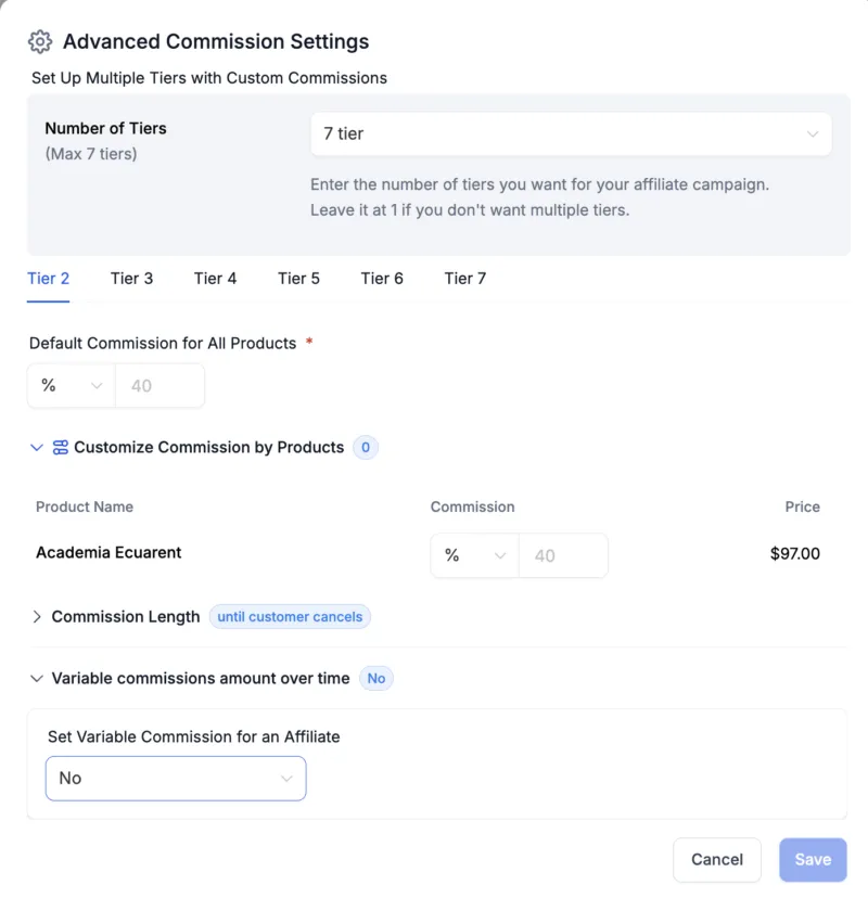 By default, a new campaign is single-tier (just direct referrals). To enable multiple tiers, find the Advanced Commission or multi-tier toggle (usually labeled as “Enable multi-tier” in the commission settings) and switch it on