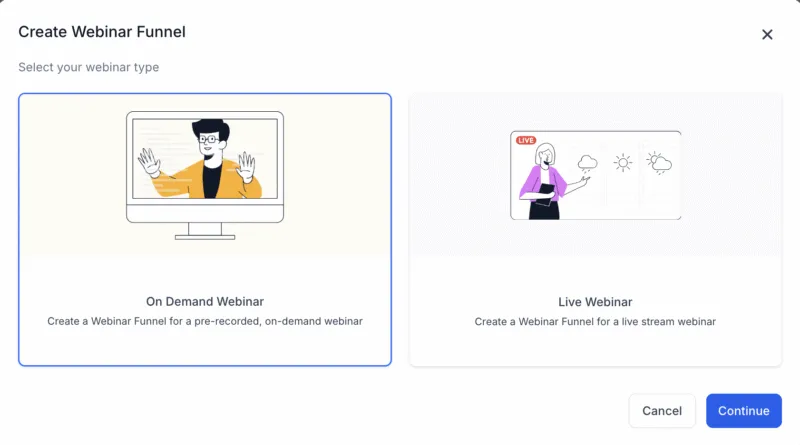 After choosing the type, you’ll fill in basic details like the webinar title, date and time (for live events), time zone, etc. The Webinar setup will automatically generate a sequence of pages for you: